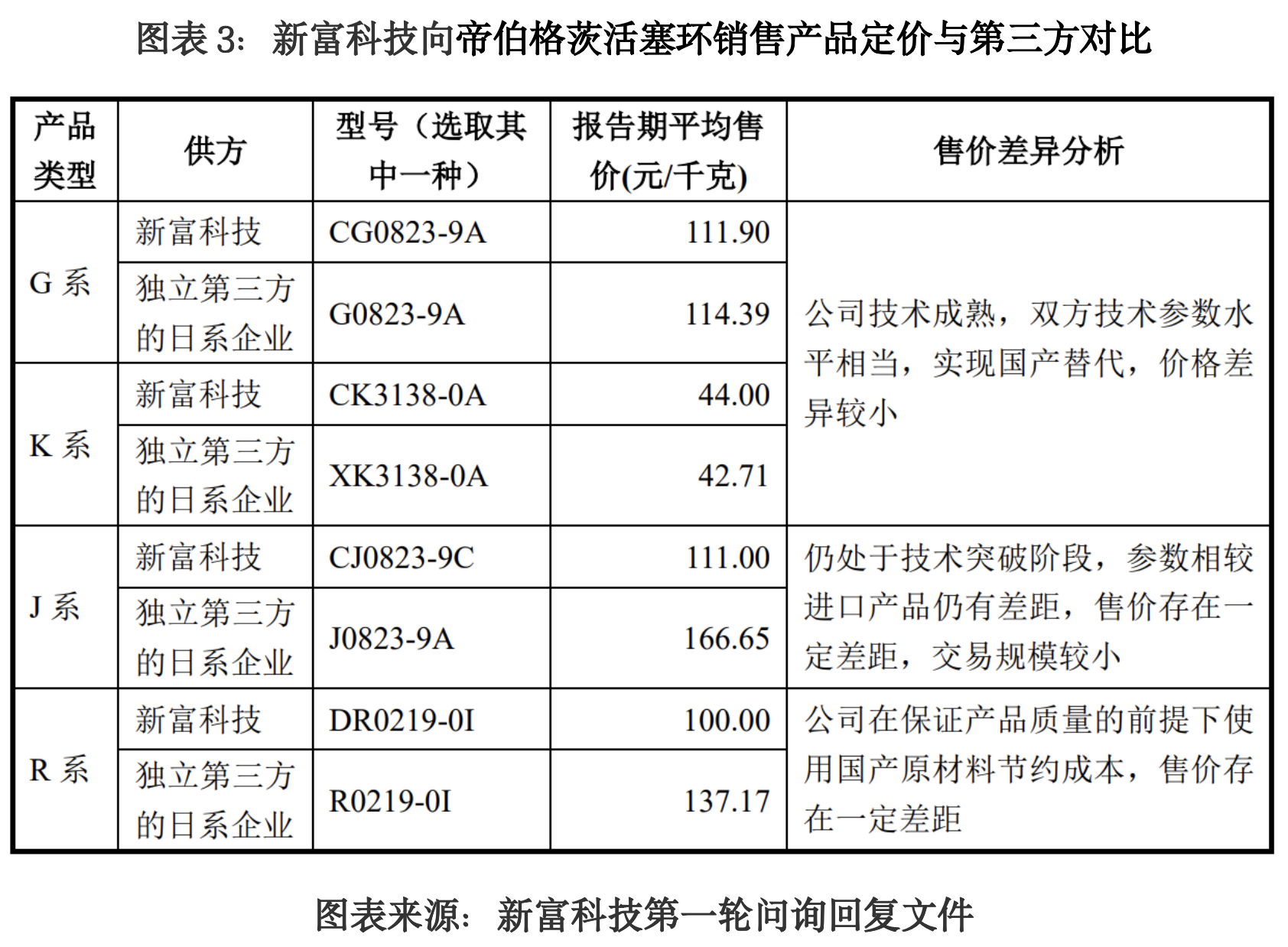 新富科技表示,其向帝伯格茨活塞环销售的活塞环线材,目前仅针对该关联方进行销售,未向其他第三方客户销售相同规格、型号的线材产品。因此无法通过与第三方同类产品的交易价格进行直接对比。而根据帝伯格茨活塞环实际采购的主要产品类型并选取其向独立第三方采购相近型号产品价格进行对比,同样出现较大差异,对此,新富科技称主要是受技术参数差异及原材料价格、运输成本等因素的影响。