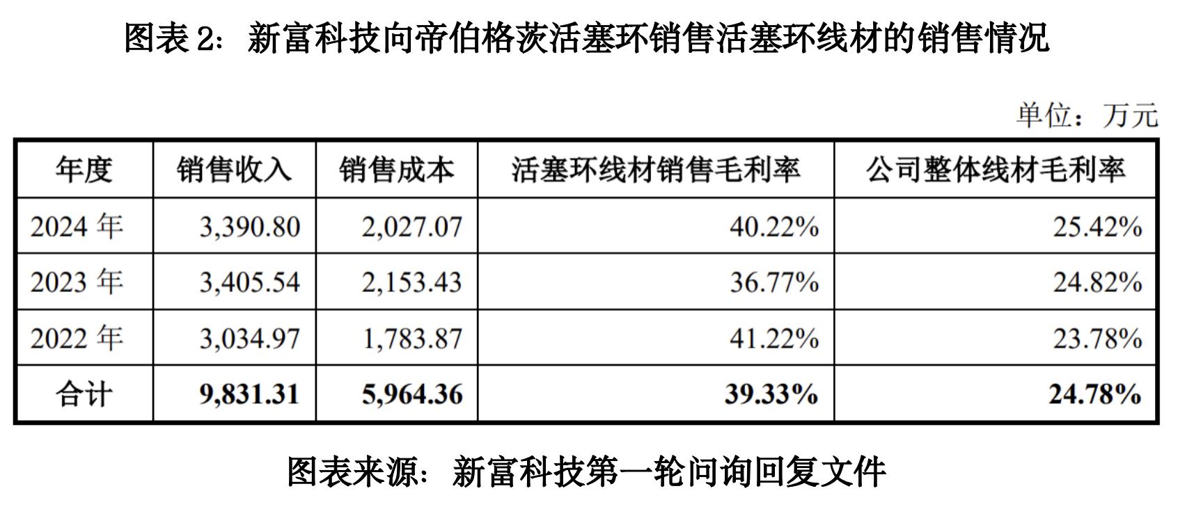 第一轮问询回复文件显示,2022—2024年,新富科技对帝伯格茨活塞环销售活塞环线材的毛利率分别为41.22%、36.77%、40.22%,而同期其整体线材毛利率分别为23.78%、24.82%、25.42%,持续远低于新富科技对帝伯格茨活塞环销售活塞环线材的毛利率。