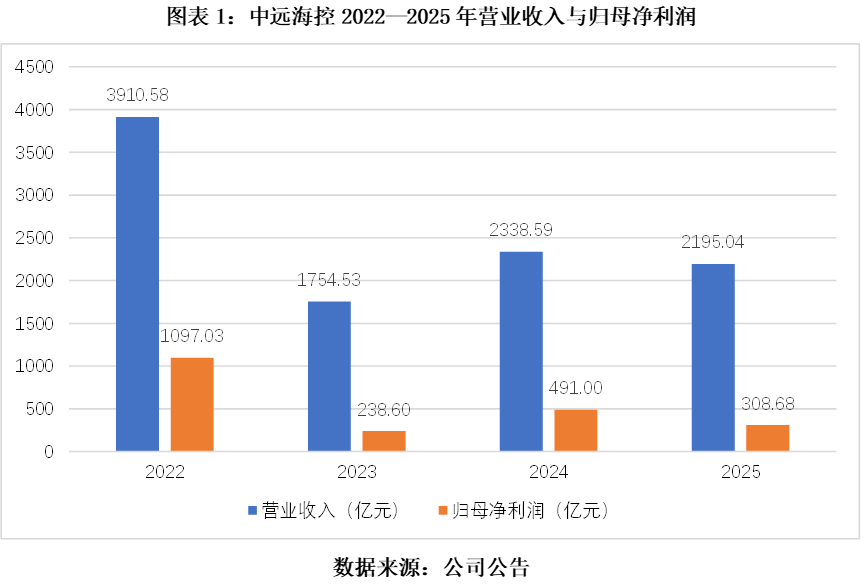 2026年3月19日,中远海控(601919.SH)发布了2025年度报告。公司全年实现营业收入2195.04亿元,同比下降6.14%;归母净利润308.68亿元,同比大幅下滑37.13%。这份“营收微降、利润大幅下滑”的财报,相较2022年巅峰期超千亿元的盈利水平已经相去甚远,呈现出明显的周期回落特征。