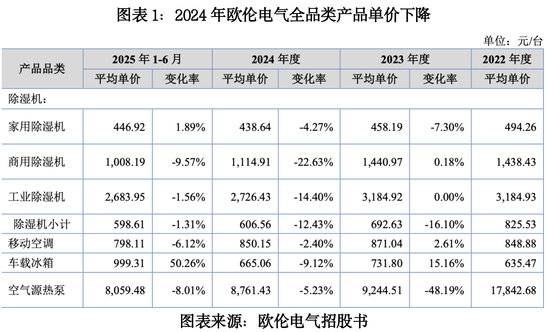 招股书显示,2024年,欧伦电气全品类产品单价同比均下降,其中,商用除湿机的单价降幅达到22.63%,空气源热泵单价三年累计降幅超48%。欧伦电气表示,除湿机价格下降是产品结构调整及薄利多销策略导致的。