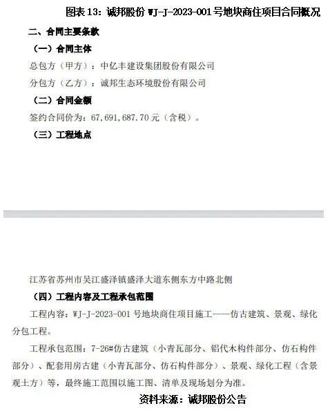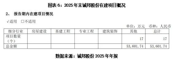2025年年报显示,诚邦股份生态环境建设业务的在建项目合计17个,总金额为5.36亿元。不过,该公司并未披露具体的项目名称,仅在“在建重大项目情况”中披露了两项工程概况:下院建设项目景观绿化工程、WJ-J-2023-001号地块商住项目仿古建筑及景观绿化分包工程。