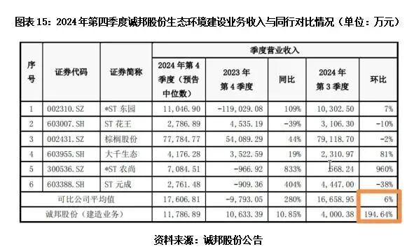 而园林工程行业有着明显的季节性特征,受冬季施工条件受限、地方财政结算节奏影响,第四季度通常为行业营收淡季。公告显示,同行业可比上市公司2024年第四季度营收环比增速均值仅为6%。对比可见,诚邦股份的当季度营收高增速与行业季节性规律、整体下行的行业趋势存在较大差异。