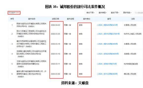除了债务压力,诚邦股份还面临涉诉事项频发的困境。据诚邦股份于2026年2月12日披露的公告,截至公告日,该公司累计涉及诉讼、仲裁事项的涉案金额合计6494.52万元,占公司最近一期经审计净资产绝对值的10.01%。天眼查数据显示,截至2026年3月31日,诚邦股份存在数量众多的司法案件,案由涵盖买卖合同纠纷、建设工程分包合同纠纷等。