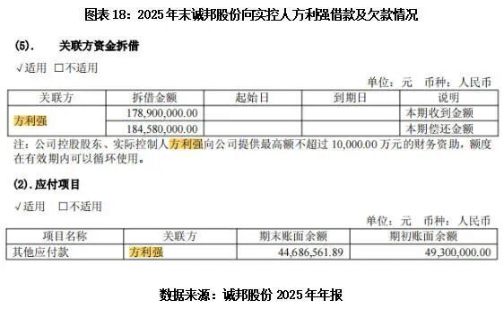 除了通过质押资产融资,诚邦股份亦向实际控制人大规模拆借资金。年报显示,2025年,诚邦股份向实际控制人方利强累计拆入资金约1.79亿元,累计偿还资金约1.85亿元;截至2025年末,诚邦股份对方利强的欠款余额仍达4468.66万元。