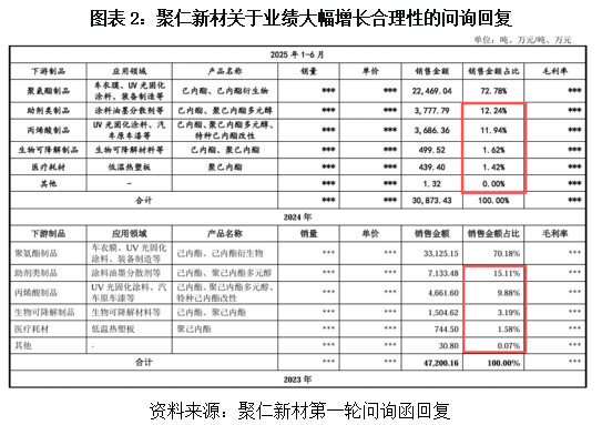 本次IPO,聚仁新材拟募资2.92亿元,其中80.5%用于新建4万吨产能。但如图表5所示,2024年该公司己内酯、己内酯衍生物的销量分别为5253.52吨、10876.24吨,产能利用率分别仅为48.95%、56.41%,而新增产能相当于现有产品销量的2.5倍,引发北交所第二轮问询:“大规模扩产的必要性及是否存在产能消化风险?”该公司给出的消化逻辑是——市场空间充足、性价比提升、大客户深度绑定——但上述解释尚需时间验证。