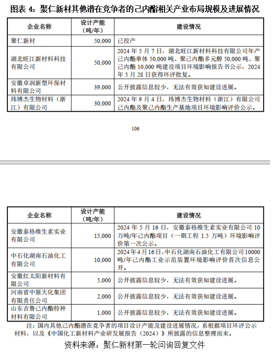 然而,如图表4所示,据聚仁新材第一轮问询回复文件披露,截至回复出具日(2025年10月30日),国内已有湖北旺江新材料科技有限公司、中石化湖南石油化工有限公司(含旗下巴陵石化)、安徽泰格维生素实业有限公司、玮博杰生物材料(浙江)有限公司4家企业公示己内酯建设项目,合计产能约10.5万吨/年,行业即将进入产能集中释放期。聚仁新材2024年主动降价35.6%以抢占份额,或已暴露其先发优势尚不足以抵御价格战的风险。