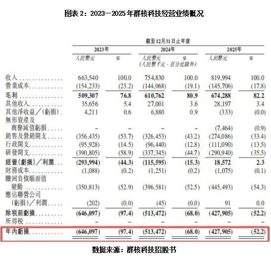 招股书显示,群核科技的营业收入虽然保持增长态势,2025年营收升至8.19亿元,但同比增速已从2024年的13.8%大幅回落至8.6%,正式跌入个位数区间;盈利层面更是连续三年深陷亏损局面,2025年净利润仍亏损4.28亿元。现金流方面,2023—2025年,该公司的经营现金流净额分别为-0.63亿元、-1.08亿元、-0.19亿元,连续三年净流出,自我造血能力不足。
