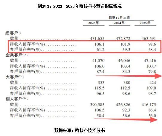 作为衡量SaaS企业健康度的核心指标,群核科技的净收入留存率从2023年的106.1%持续下滑至2025年的98.6%,首次跌破100%的临界点,意味着存量客户的收入贡献已出现萎缩。此外,其客户结构分化进一步加剧经营压力,同期整体客户留存率从61.2%降至58.4%,个人客户留存率更是从58.4%下滑至56%,中小客户流失问题尤为突出。