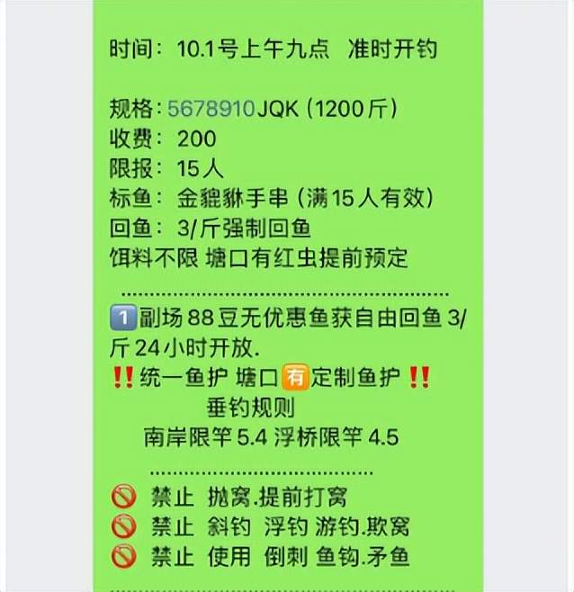 实际上,趁着国庆假期,部分鱼塘主也赚得盆满钵满。来自安徽省阜阳市某鱼塘主刘彪表示,按照往年经验,鱼塘国庆客流量会从日常的几人或十几人增加到五六十人。基于此,他9月就提前对鱼塘进行清理。今年国庆直接举办一个钓鱼大赛,参赛者每人收费200元,钓鱼斤数最高者可获得金貔貅手串一个,副场地则按照88元/人进行收费。除门票收入外,鱼塘内售卖的烟、泡面、软饮料及鱼饵、鱼线等其他产品,预估日收入或在万元。