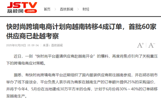 但耐人寻味的是,已有内媒体报道指出,某快时尚跨境电商开始组织多家供应商奔赴越南考察,且这次行动极为低调。有消息人士指出,该快时尚跨境电商便是SHEIN。