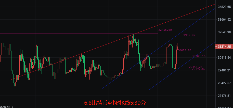 大饼今天的一幕是不是很惊喜,美盘开盘以后就开始发力,和预期一样低开高走向上拉伸,这是一贯思路,顺势跟进29600附近多头最后分批30000-31300两次出局,加上昨日发稿30600顺势空最后止盈29300,目标空拿下1300点,目标多拿下1700点,多空刚好3000点空间。是不是很完美,拿捏的相当到位,日K线开盘跳水,收盘回拉,这一根下影线回调,MA15-30的金叉刚好成型上拉,MACD放量上行,DIF和DEA依旧是低位向上扩散,KDJ向上开口,日K线再一次承压上轨31800压力位。