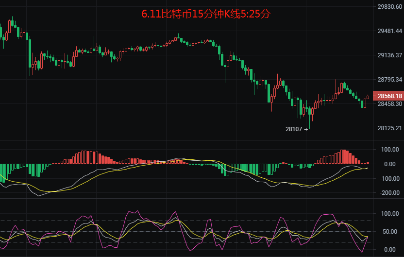 日K线发稿前基本确定五连阴成型,下方支撑28000-28300,MACD放量下行,今日日线在收阴线,DIF和DEA就会形成死叉,KDJ向下跳水,布林带下轨防守28000.空头情绪太浓稳健者不建议和主力夺食。