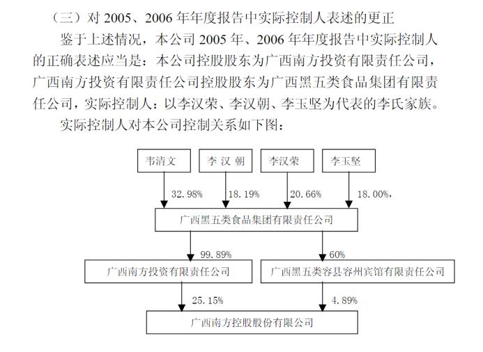 2004年3月-2006年6月,上市公司第七大股东广西南方投资有限责任公司(黑五类集团的前身,简称“南方投资”)通过受让、司法拍卖等方式持有上市公司25.09%股份,成为第一大股东,以李汉荣、李汉朝为代表的李氏家族成为上市公司的实际控制人。