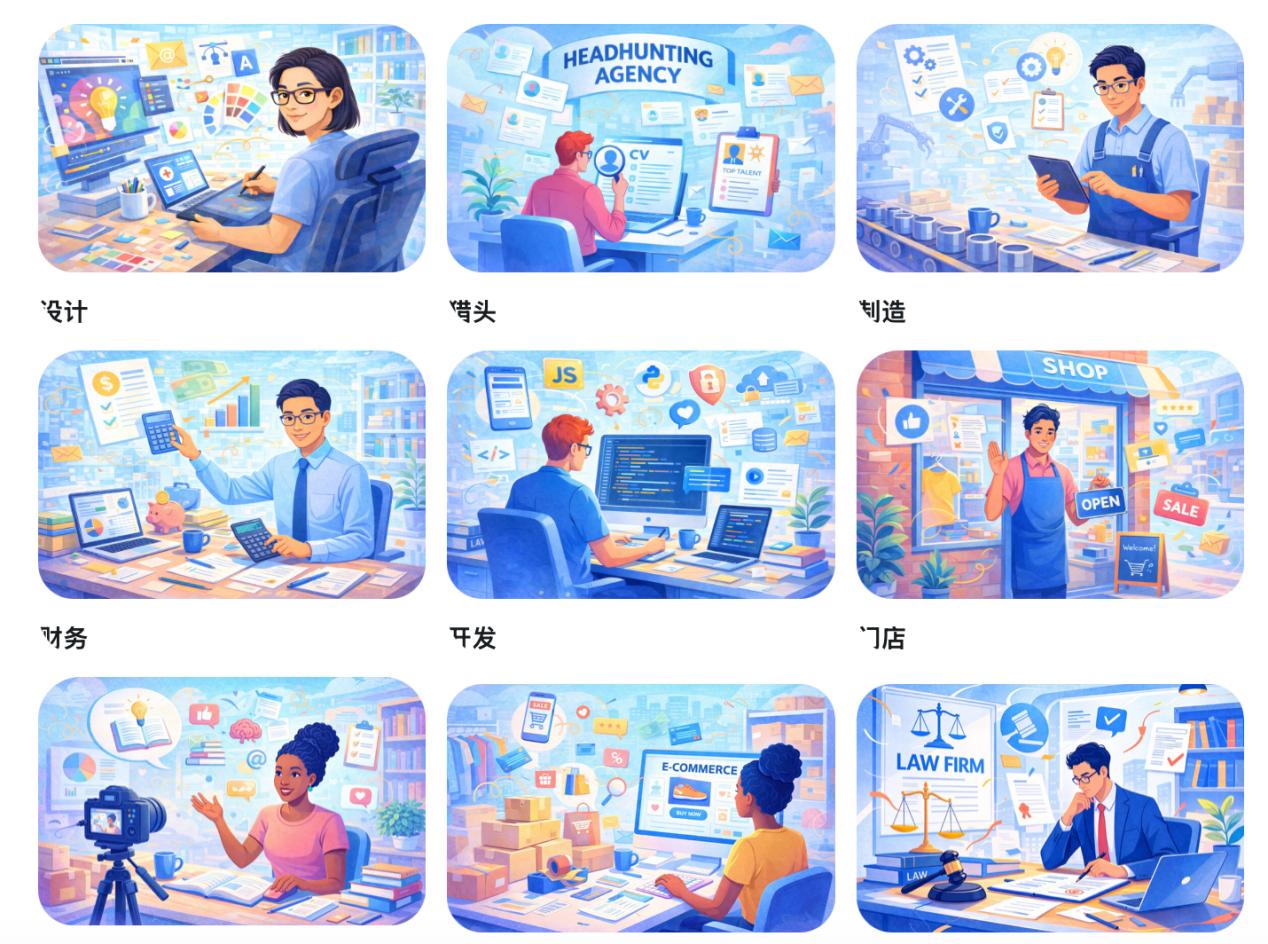 覆盖十个行业:一人电商、跨境电商、知识博主、一人门店、一人律师团队、一人设计团队、一人制造团队、一人财务团队、一人猎头团队、一人开发团队。说白了,就是让你一个人,拥有一支精通特定行业的AI团队。