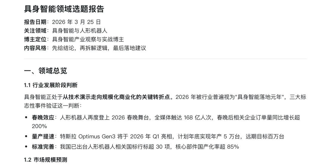 所谓“内容雷达”,其实就是一个AI驱动的选题情报系统。我在对话框内输入:“给我一份具身智能领域的选题报告。”
