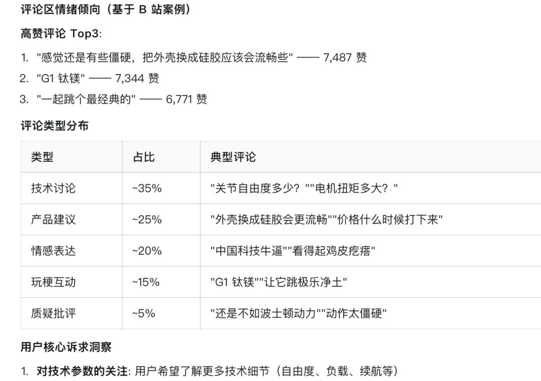 它不仅统计了高赞评论,还分析了评论类型分布,最后给出了“用户核心诉求洞察”,这些信息对于内容创作者来说,价值不亚于一份完整的市场调研。