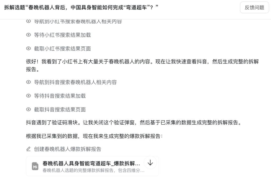 接着试爆款拆解。我输入了一个选题:“春晚机器人背后,中国具身智能如何完成‘弯道超车’”。悟空自动在小红书、B站、抖音三个平台扩词搜索,筛选高赞爆款,抓取评论区热评,生成了一份多平台对比拆解报告。