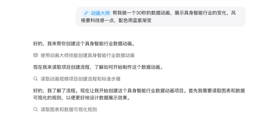 我用自然语言描述:“帮我做一个30秒的数据动画,展示具身智能行业的变化,风格要科技感一点,配色用蓝紫渐变。”