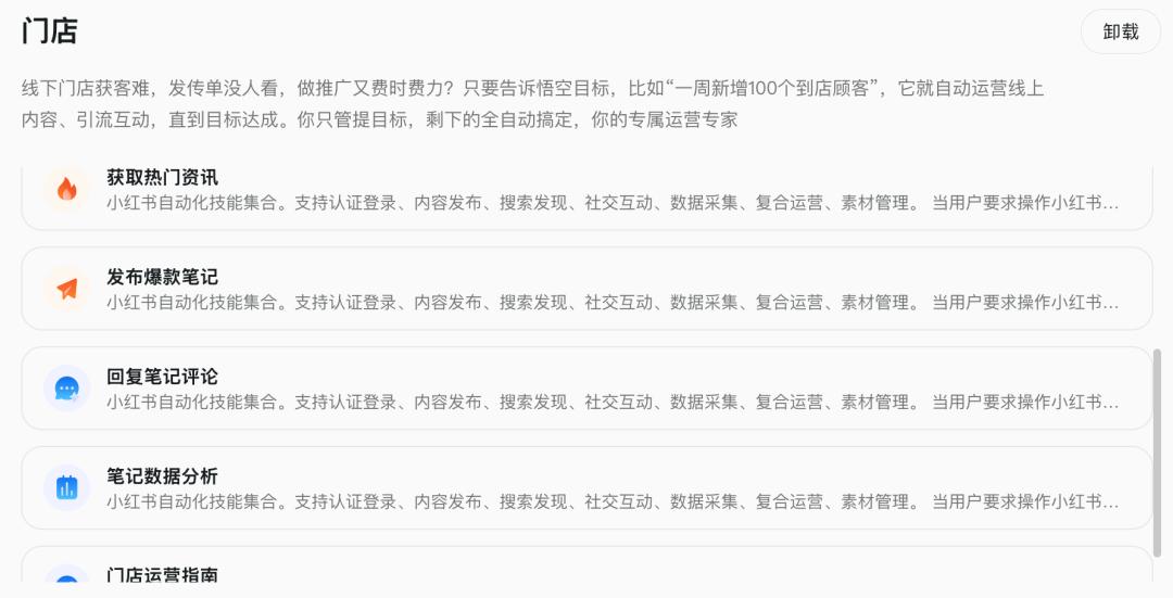 受此启发,我也尝试了一下“一人门店”的技能。这一板块内置了五大技能:获取热门资讯、发布爆款笔记、回复笔记评论、笔记数据分析和门店运营指南。我重点测试了前两种。