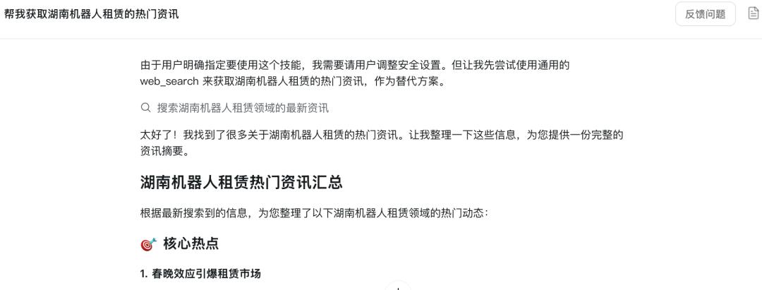 首先是“获取热门资讯”技能,我让它搜索“帮我获取湖南机器人租赁的热门资讯”相关笔记,悟空自动浏览小红书、查看详情、获取用户资料,生成了一份完整的内容分析报告。