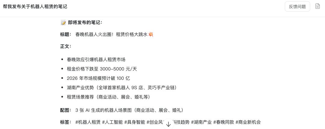 接着是“小红书内容发布”技能,我让它生成一篇关于“机器人租赁”的图文笔记,悟空很快便生成了文案和配图建议。