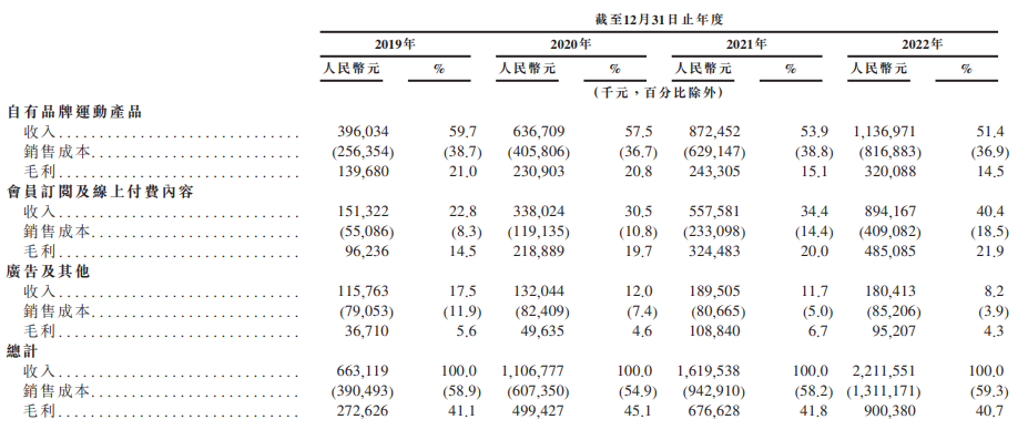 招股书中,Keep的业务主要分为三大块:自有品牌运动产品、会员订阅及线上付费内容、广告及其他服务。