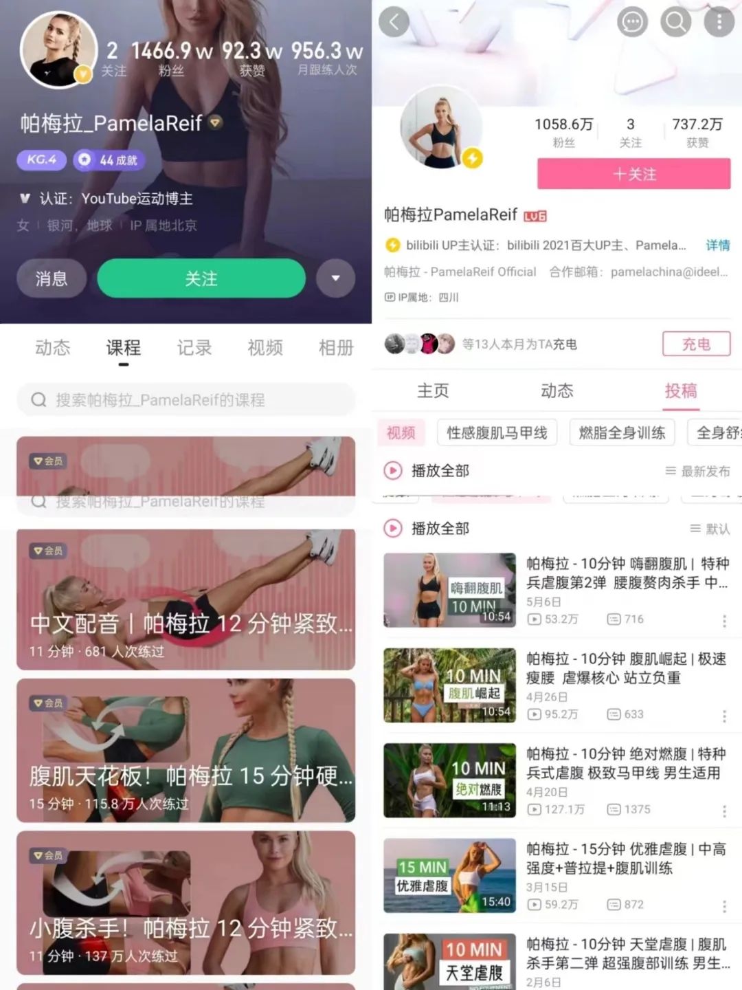 以顶流健身博主帕梅拉的课程内容为例,不难看到,其在Keep和B站的粉丝数均超过了千万级别,日常内容流量均在几十万到几百万区间。两者最大的区别在于一方需要支付单月最高达25元的会员订阅费,另一方则全部免费。