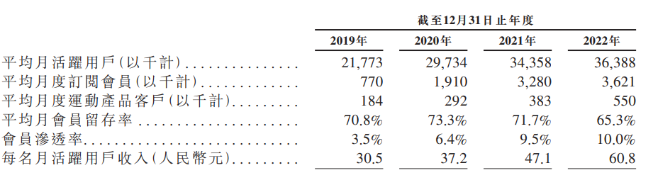 2020年前两个季度,Keep的平均月活人数攀升明显,从2019年一、二季度的1553.5千万、2243.6千万增长至2710.3千万、3325.1千万。全年平均订阅会员人数开始翻倍上涨,从2019年的77万一路激增至2022年的362.1万。
