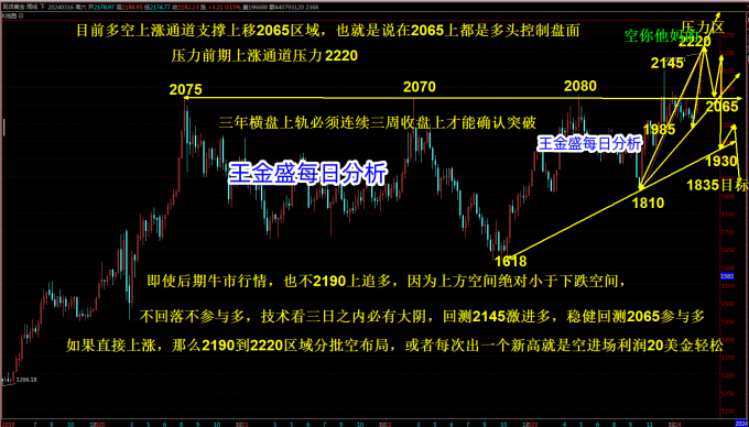 昨日破位5日均线,压力下移2170区域也就是说遇到这里依然继续空,毕竟昨日通胀暗示3月降息无望。技术看周线收盘大阳,暗示惯性还有新高出现,也就是说多头最好横盘以后再出一个新高突破上周2195高点以后在跌才能大幅调整,如果直接调整,空间不大直接在盘中洗盘以后又是震荡拉升,上周收盘涨幅96美金,自2080开启上涨,就是说回落一半43美金在2125附近多安全,当然稳健回测三年上轨2070到2065参与,目前这是静态分析技术回测,如果3月美联储会议针对降息没有市场预期那样随时变盘都是存在,要知道2145新高出现单日下跌120美金行情后期随时存在。技术和基本面共振利空下跌以后,我们再从国际黄金持仓找到端倪!