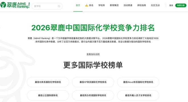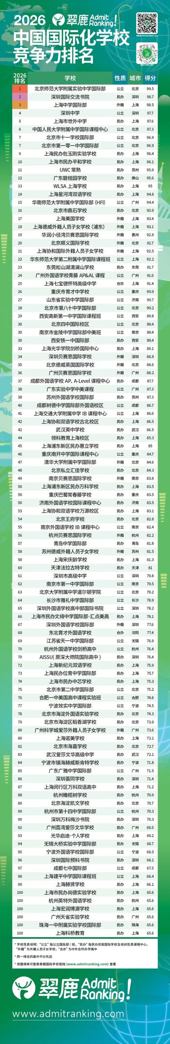 近日,中国国际教育领域再迎备受关注的权威评估成果——由国际化学校数据研究机构翠鹿(Admit! Ranking)发布的《2026翠鹿中国国际化学校竞争力排名》正式揭晓。相比以往同行榜单,本次排名最大的亮点在于以真实教育数据为底层逻辑,以百万级客观数据指标进行量化分析,并构建覆盖从办学质量到升学结果的多维度测评体系,被业内视为具有较高参考价值的全数据型教育评估成果。