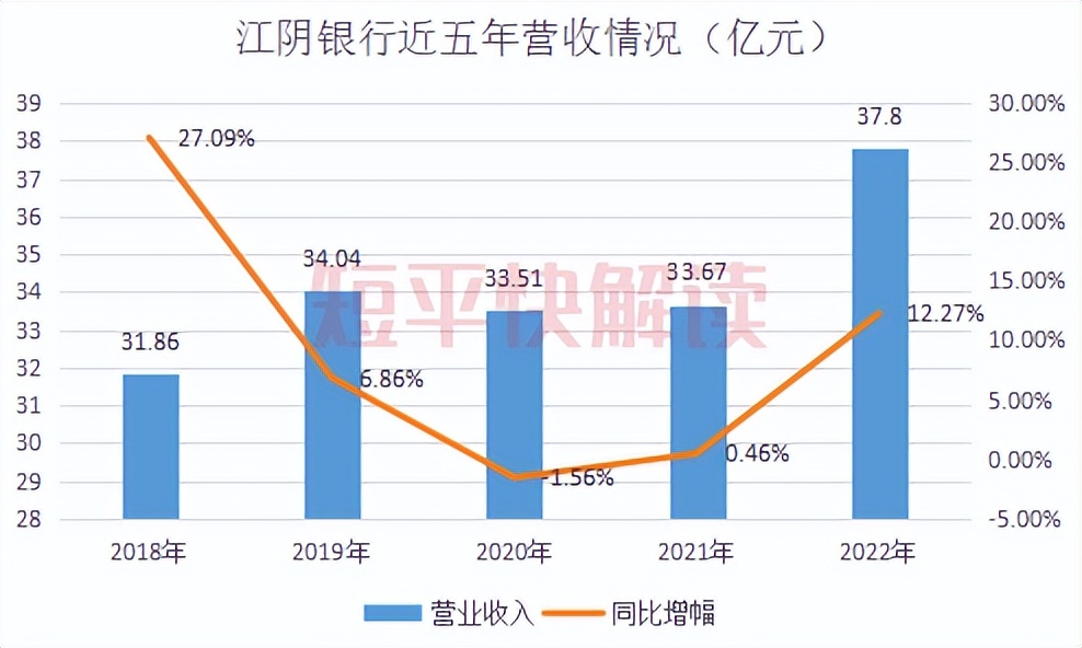 营收方面,江阴银行的最近五年的营业收入分别为31.86亿元、34.04亿元、33.51亿元、33.67亿元、37.8亿元,同比分别变动27.09%、6.86%、-1.56%、0.46%、12.27%。营收总体呈现增长态势,但存在较大波动,另外,年均复合增长率仅为4.37%,远远逊色于资产增速。