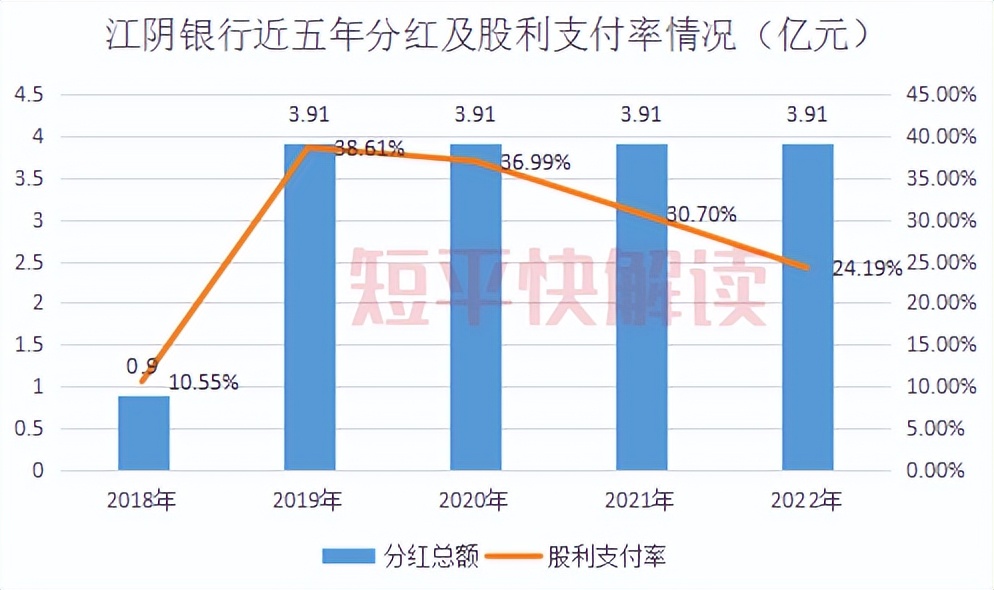 最近五年,江阴银行营收总体呈现上升态势,中间略有波动,归母净利润屡创新高,但公司的分红总额已经连续四年保持一致,均为3.91亿元,股利支付率则从2019年38.61%下滑至2022年的24.19%。