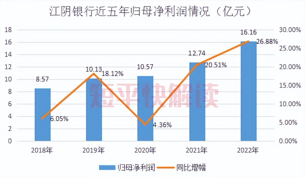 净利方面,江阴银行近五年的归母净利润保持增长态势,分别为8.57亿元、10.13亿元、10.57亿元、12.74亿元、16.16亿元,同比分别增长6.05%、18.12%、4.36%、20.51%、26.88%。