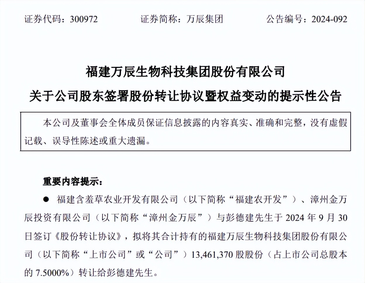 根据公告,公司股东福建含羞草农业开发有限公司(福建农开发)、漳州金万辰投资有限公司(漳州金万辰)与彭德建在9月30日签署《股权转让协议》,拟将其合计持有万辰集团1346.14万股(占总股本7.5%)转让给彭德建,转让价格27.91元/股,交易对价3.76亿元。