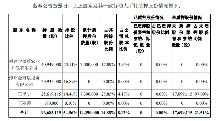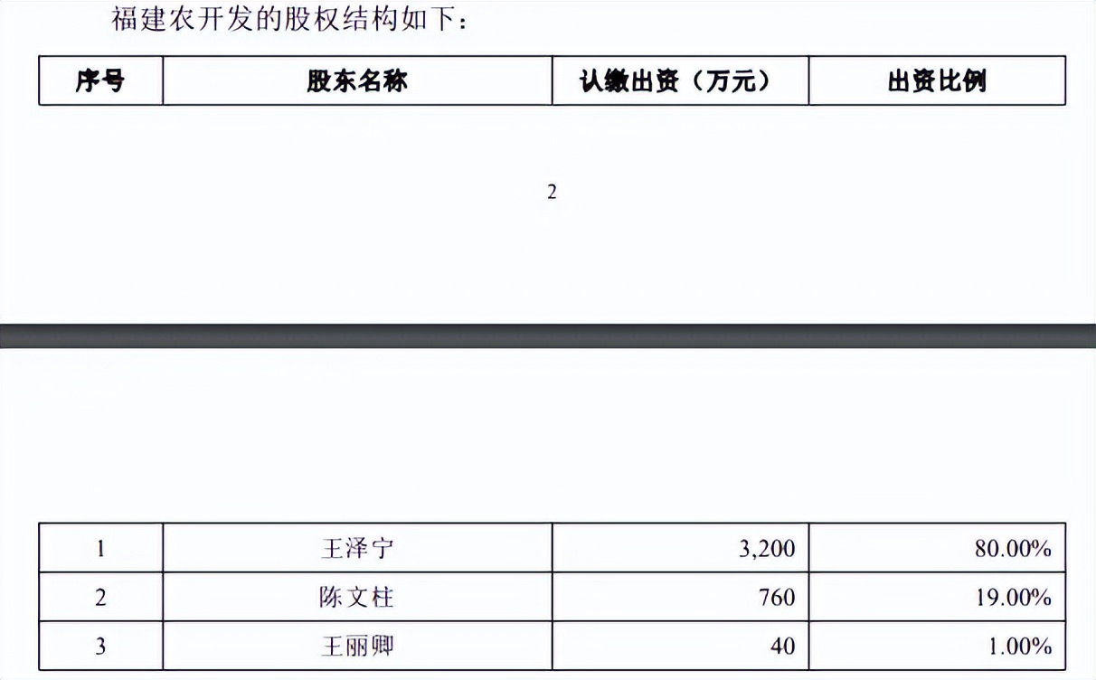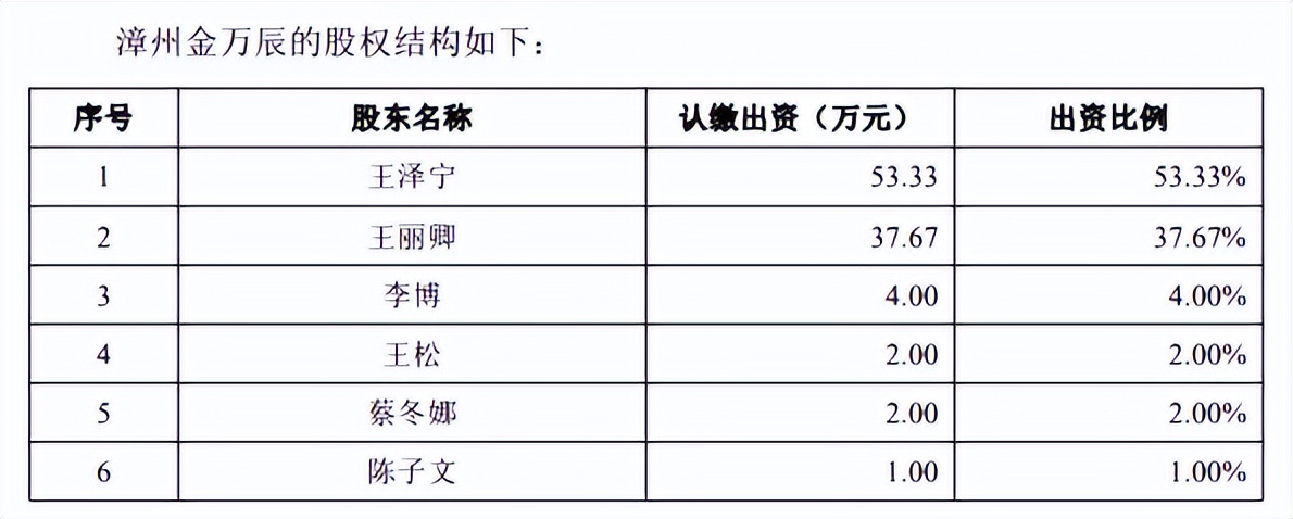 漳州金万辰是一家对现代农业项目投资的企业,王泽宁、王丽卿的持股比例分别为53.33%、37.67%。