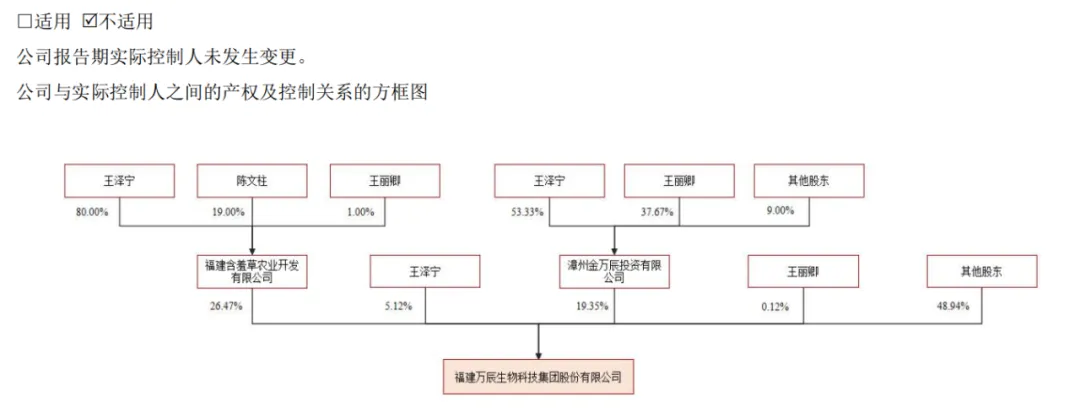 2023年报显示,王泽宁、王丽卿、陈文柱是万辰集团实际控制人,持股比例分别为41.96%、6.59%、4.39%,合计近53%,这意味本次股权转让是实际控制人主导的。