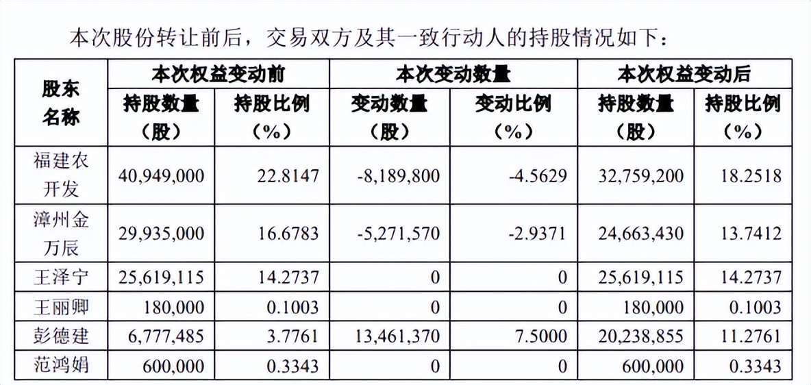 具体来看,福建农开发、漳州金万辰分别向彭德建转让818.98万股、527.16万股,交易对价分别为2.29亿元、1.47亿元。