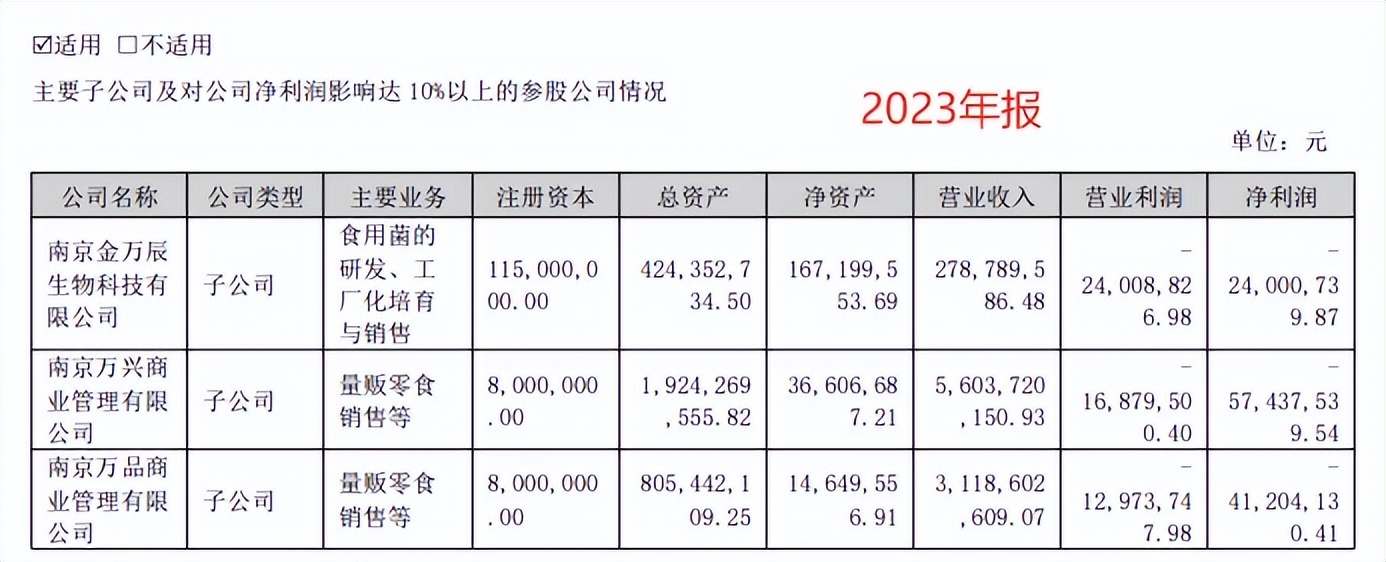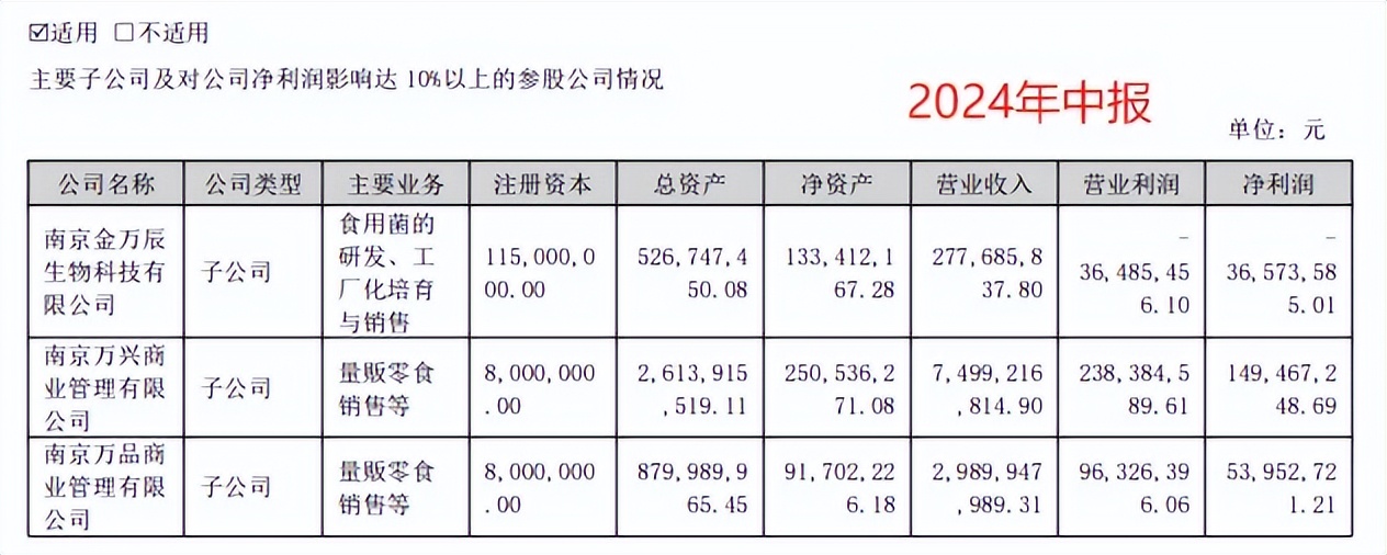 实际上,万辰集团在2023年报中就称食用菌业务出现亏损了,今年上半年延续亏损态势,另外,主营食用菌业务的南京金万分别亏损0.24亿元、0.37亿元,可见食用菌业务亏损进一步加剧,影响了利润水平。