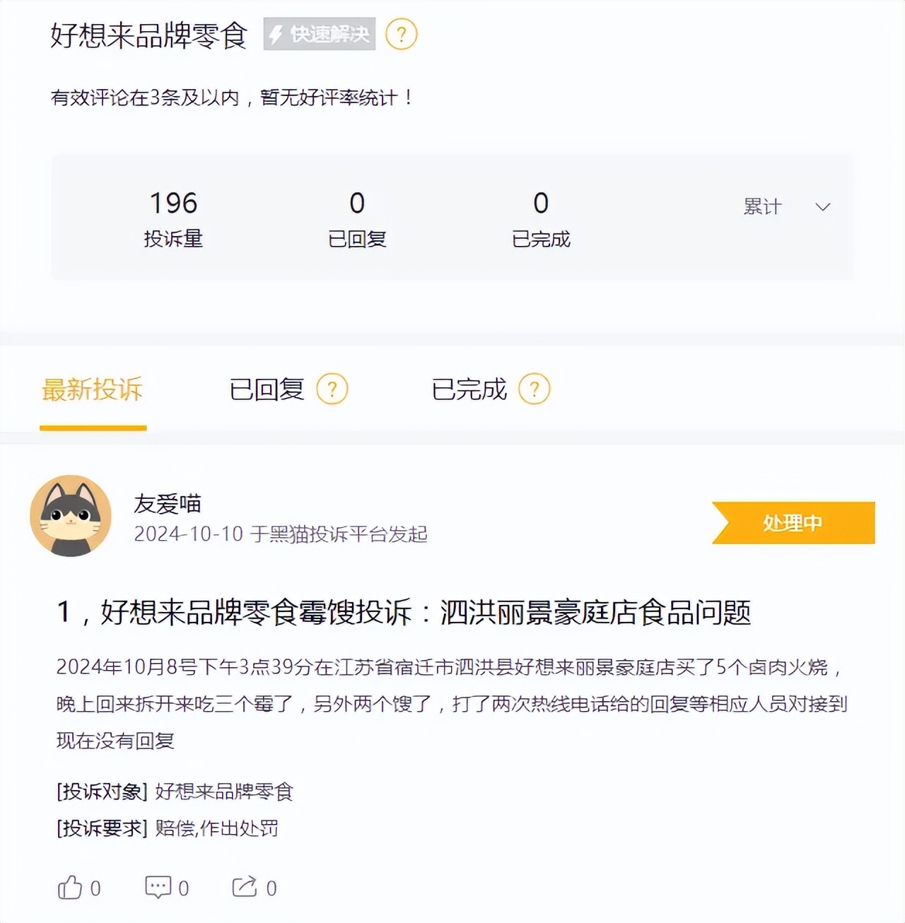 据黑猫投诉,截至10月10日,好想来品牌零食投诉量196条,已回复、已完成均为0,妥善解决消费者提出的合理诉求是品牌方当务之急。因为门店多以加盟为主,品牌方要发挥好“纽带”作用,让双方尽可能满意。