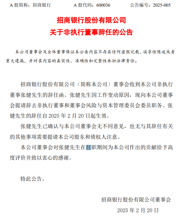 2月20日晚,招商银行公告称,因工作变动原因,张健向本公司董事会提请辞去非执行董事和董事会风险与资本管理委员会委员职务。