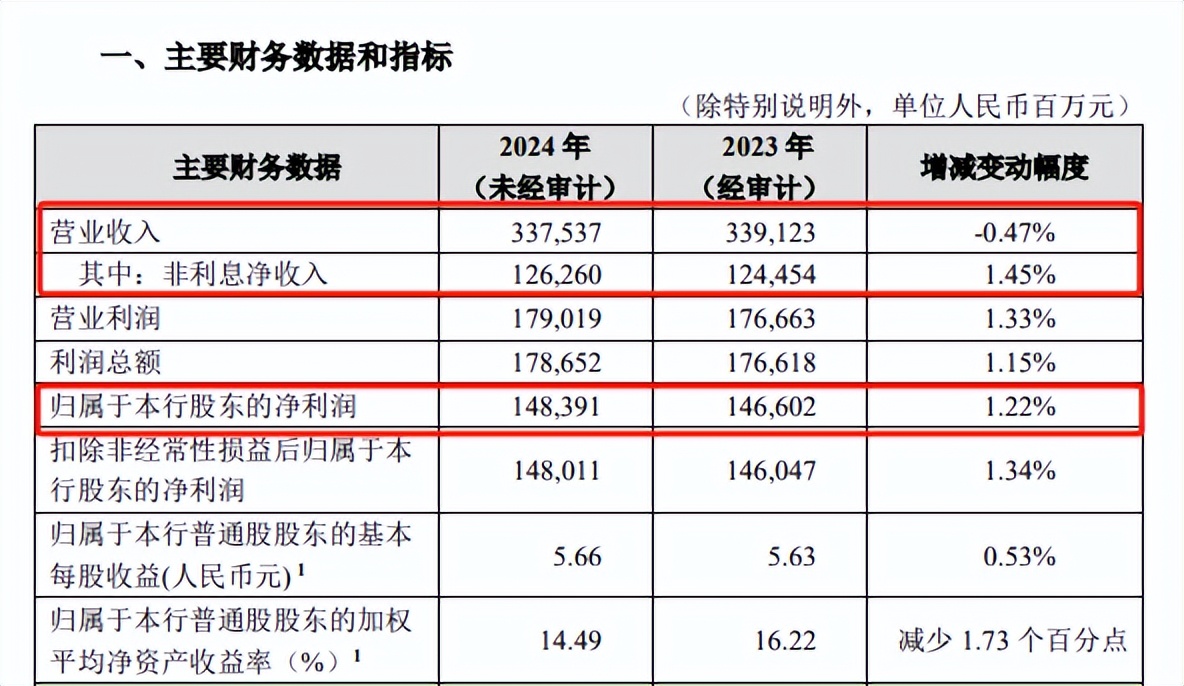 根据2024年业绩快报,招商银行实现营业收入3375.37亿元,同比下滑0.47%,其中非利息净收入1262.6亿元,同比增长1.45%,这意味着利息净收入同比下滑。归母净利润为1483.91亿元,同比增长1.22%。