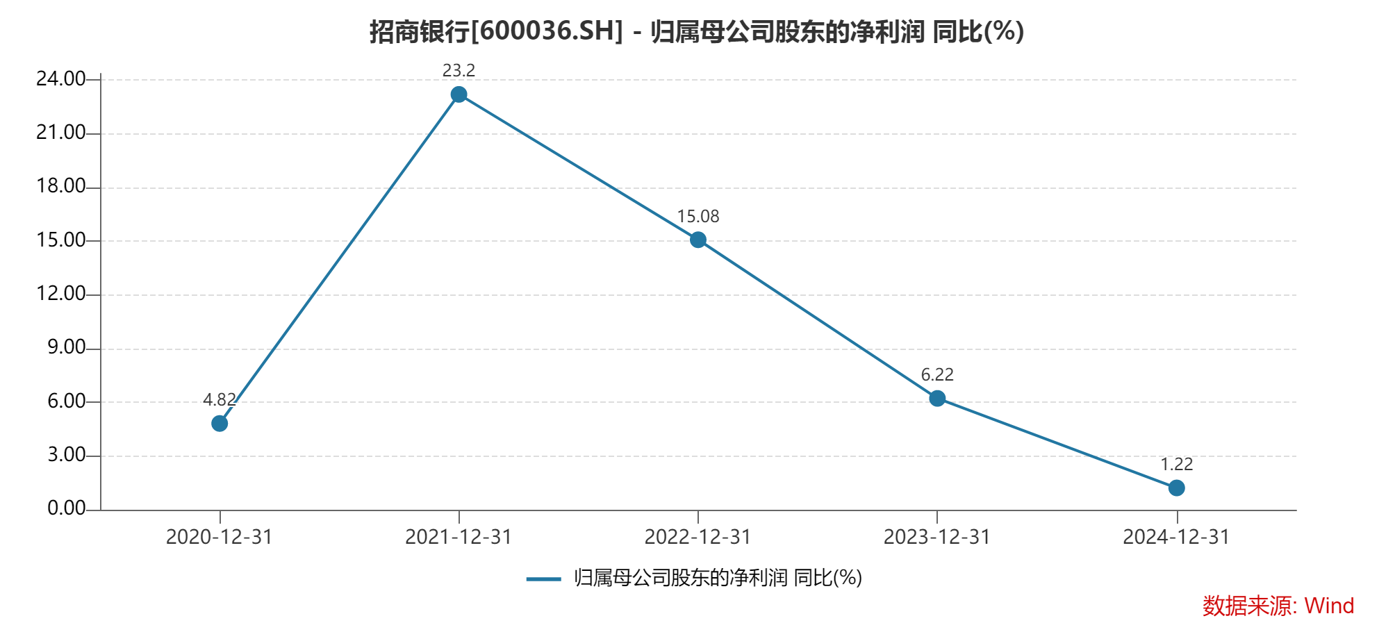 拉长时间线来看,招商银行的营业收入已经连续两年下滑;归母净利润增速自2021年以来持续下滑,从23.2%下滑至去年的1.22%,面临着业绩增长瓶颈。