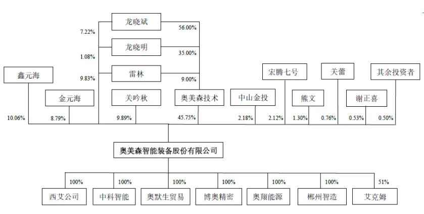 两对夫妻是实控人。奥美森控股股东是奥美森技术,持股比例45.75%,实际控制人是龙晓斌、龙晓明、关吟秋及雷林,龙晓斌、龙晓明为兄弟关系,龙晓斌、关吟秋,龙晓明、雷林均为夫妻关系,换而言之,奥美森实际控制人是两对夫妻,还是亲戚关系。