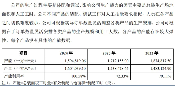 产能利用率波动大。2021年至2024年,奥美森的产能利用率分别为100.23%、79.11%、72.33%、以及100.58%,期末产能为1,594,819.06平方米*天。