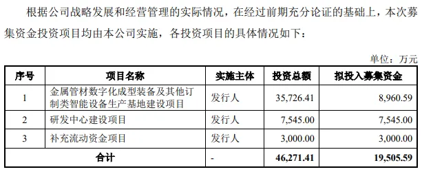 本次IPO,奥美森拟向不特定合格投资者公开发行规模不超过2,000万股,募集资金19,505.59万元,用于金属管材数字化成型装备及其他订制类智能设备生产基地建设项目、研发中心建设项目以及补充流动资金,拟投入募集资金金额分别为8,960.59万元、7,545.00万元、3,000.00万元。