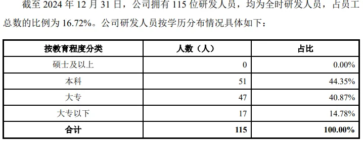 截至2024年,公司共有115位研发人员,占比16.72%,其中本科、大专、大专以下的研发人员分别为51人、47人、17人事,没有一个学历是硕士及以上的研究人员。