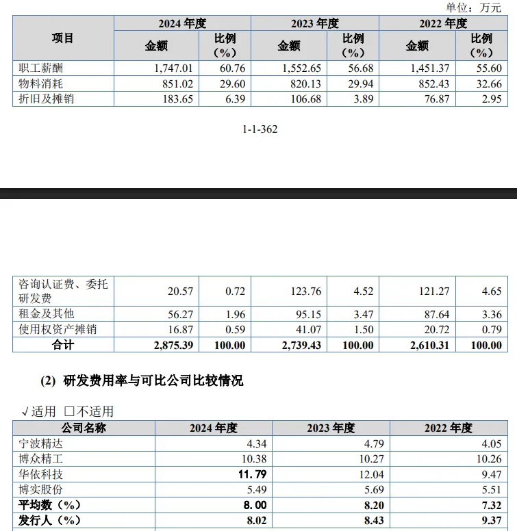 另外,公司研发费用率高于可比同行行业均值,后者分别为7.32%、8.2%、8%,2024年,4家可比同行中,博众精工、华依科技研发费用率分别为10.38%、11.79%,超过公司,而宁波精达、博实股份分别为4.34%、5.49%,低于公司,可以说公司研发投入处在中游位置。
