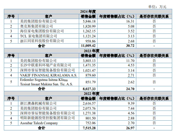 前五大客户变动频繁。奥美森服务于众多客户,主要以家电领域为主,包括美的集团、格力电器、奥克斯、海信家电、TCL家电等等,而报告期内的前五大客户变动比较大,2023年,浙江澳森机械有限公司、明阳新能源投资控股集团有限公司、AsoubarTaleshCompany消失在前五大客户之列,2024年,长沙中联重科环境产业有限公司、深圳市誉辰智能装备股份有限公司、VAKIFFINANSAL、ErdemlerSogutma消失在前五大客户之列。