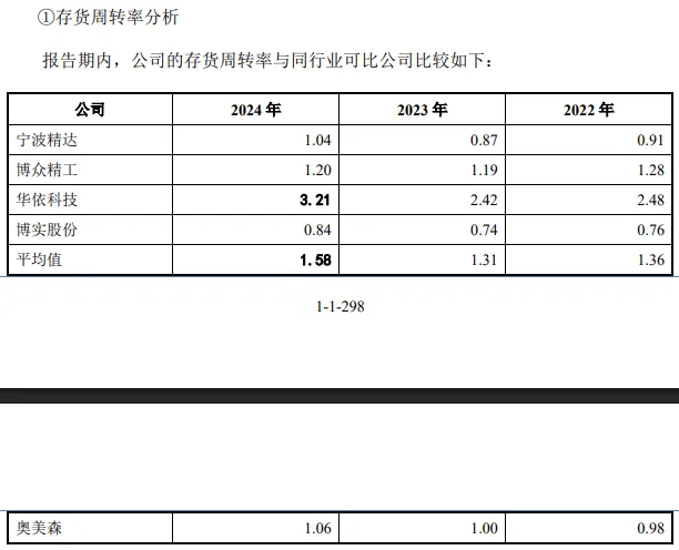 对比来看,奥美森的存货周转率低于可比公司平均水平,后者分别为1.36%、1.31%、1.58%,公司称主要系不同产品验收周期存在差异所致,2024年,博众精工、华依科技分别为1.2%、3.21%,均超过公司,而宁波精达、博实股份分别为1.04%、0.84%,均落后于公司。