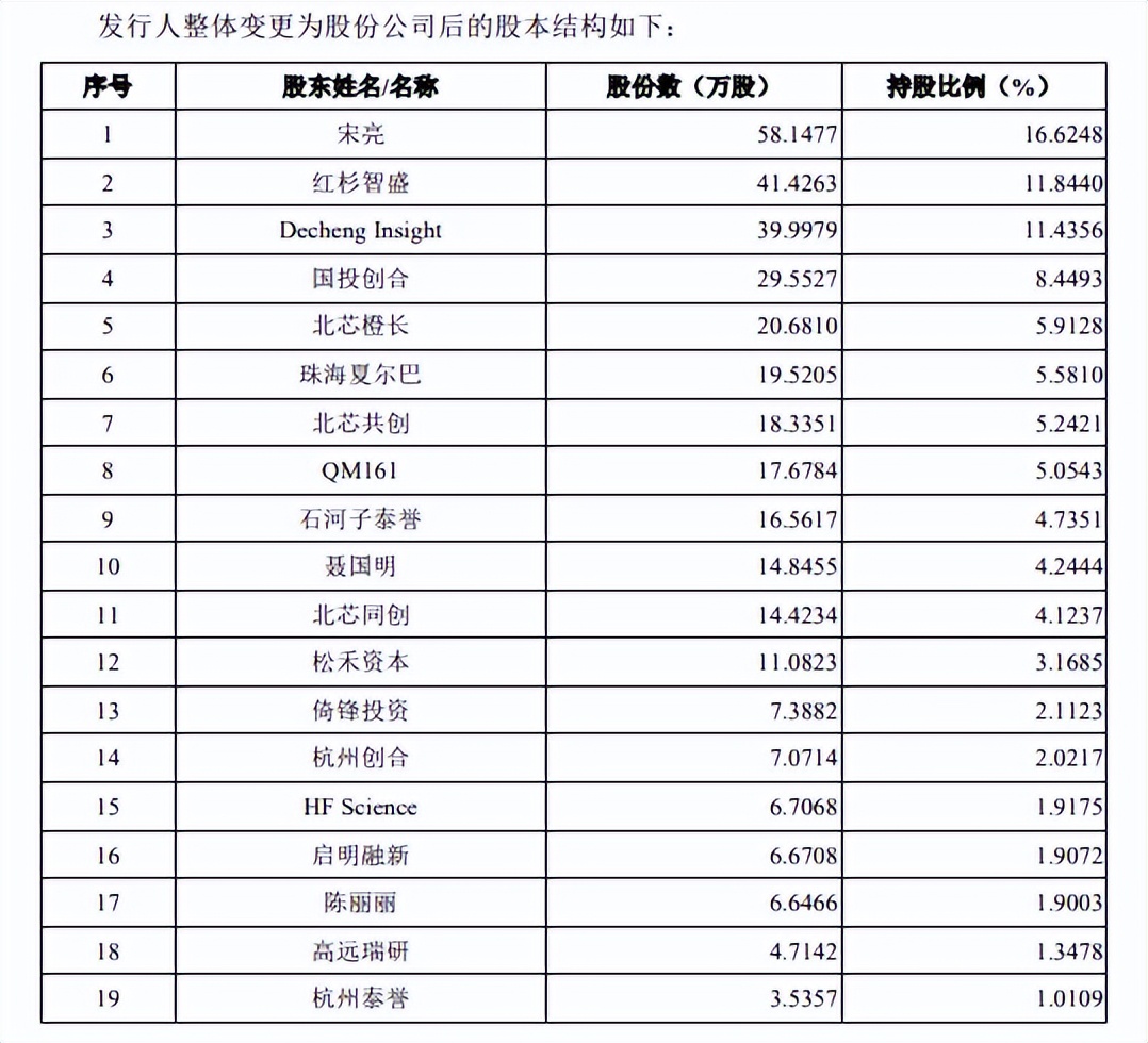 股权高度分散。2021年6月,北芯生命完成股份制改革,彼时共有24名股东,创始人宋亮直接持股比例仅16.62%,而红杉智盛、DechengInsight、国投创合持股比例分别为11.84%、11.44%、8.45%。